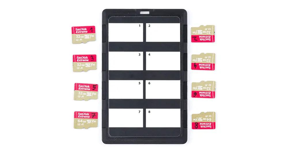 8 tarjetas MicroSD de 32GB de capacidad clase V30.